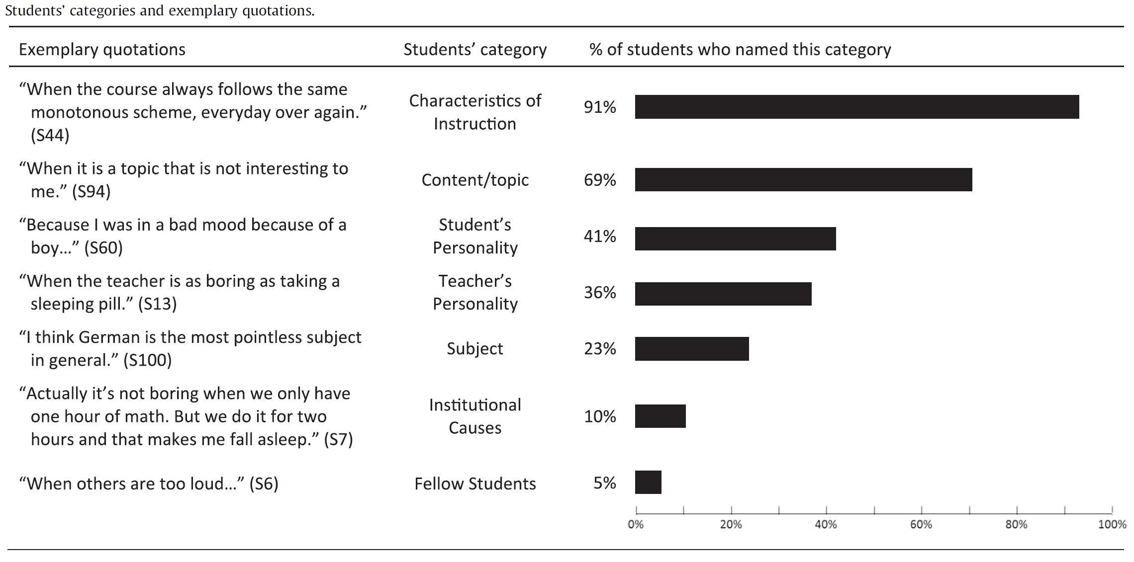Researchers in Germany (Daschmann, 2014, pp. 22-30) interviewed 111 ninth graders and their teachers to better understand what bored students in school. The results speak for themselves: